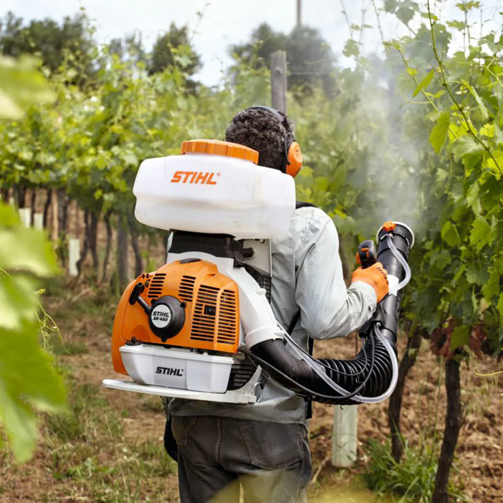 La motopulverizadora de mochila STIHL SR 450 es una herramienta versátil y potente, diseñada para aplicaciones profesionales de pulverización y dispersión de líquidos, fertilizantes, herbicidas, insecticidas, granulados y semillas. Cilindrada 63,3 cm³. Peso 12.8Kg. Capacidad tanque de pulverización 14L. Caudal máximo de aire 1.300 m³/h. Alcance horizontal 14.5m. Potencia 3.9Hp. Capacidad depósito de gasolina 1.70L. Caudal de aire con boquilla redonda 920 m3/h.