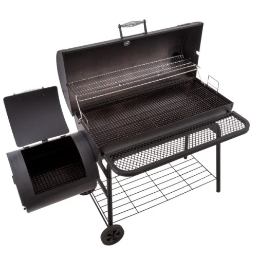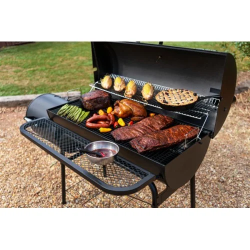 Disfrute de una experiencia de ahumado y asado tradicional con el ahumador 1280 Offset Smoker de gran capacidad. Tres rejillas revestidas de porcelana y una rejilla secundaria cromada le ayudarán a sacar el máximo partido de su enorme superficie total de cocción de 1.280 pulgadas cuadradas. Varias compuertas para controlar fácilmente el calor y el humo. Indicador de temperatura montado en la tapa para controlar el calor. Bandeja de carbón ajustable en altura en cuatro niveles para cocinar con versatilidad. Tapa con asa de tacto frío. Tres rejillas de cocción revestidas de porcelana resistentes al óxido. Puerta de la cámara de combustión para retirar las cenizas. Ruedas para facilitar la movilidad. Dimensiones externas: 153 cm de largo x 72 cm de profunidad x  130 cm de alto