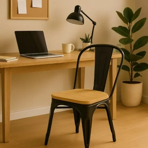 Silla de la marca TENYALE combina estructura metálica en negro mate con un asiento de madera natural, logrando una estética equilibrada entre lo industrial y lo cálido. Su diseño limpio y resistente la convierte en una opción ideal para comedores, cocinas, estudios o espacios comerciales que buscan estilo sin complicaciones. Medidas: Alto: 82 cm Ancho: 44 cm Profundidad: 59.5 cm Imágenes meramente ilustrativas.