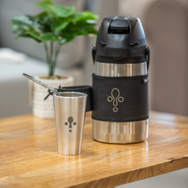 Termo Indio Acero Inoxidable 1.3 Litros Frío/Calor Faja Cuero Negro con Guampa Tereré+Mate – Alpaca