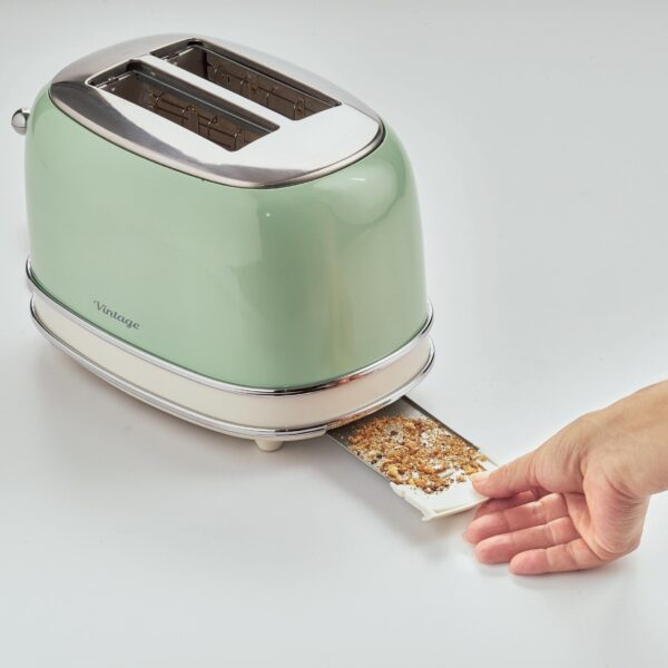 Tostadora vintage de 2 rebanadas sin pinzas para tostar rebanadas simples o sándwiches rellenos, con expulsión automática y bandeja recogemigas extraíble, 6 niveles de tostado, laterales fríos y función de descongelación, calentamiento y cocción. Imágenes meramente ilustrativas. Garantía de 12 meses por desperfectos de fábrica.